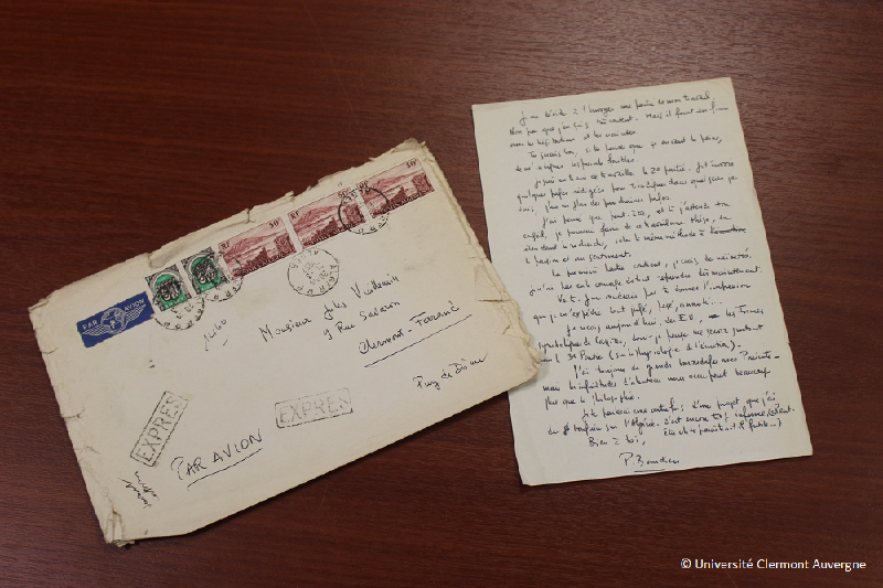 Une bonne partie de la bibliothèque du laboratoire PHIER a été constituée par Jules Vuillemin. Un certain nombre de livres sont annotés probablement de sa main. Cette lettre est un petit document d’une page, adressée à Jules Vuillemin, qui était alors professeur de philosophie à l’université de Clermont-Ferrand (de 1950 à 1962). Elle est restée là, glissée dans la couverture d’un livre, probablement depuis une soixantaine d’années, malgré les déménagements qu’ont d? connaitre les ouvrages du département de philosophie qui se sont retrouvés aujourd’hui au PHIER.