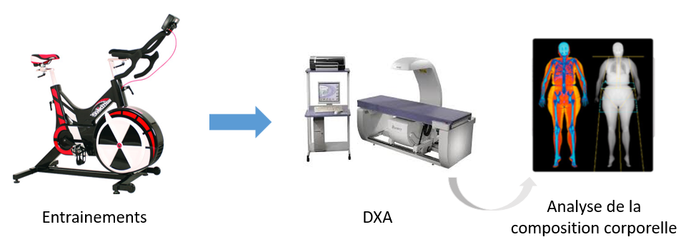 Une mesure de la composition corporelle (MG totale + abdominale, masse maigre) a été réalisée par absorptiométrie biphotonique à rayons X (ou DXA ) avant et après les 3 mois d’entrainement.